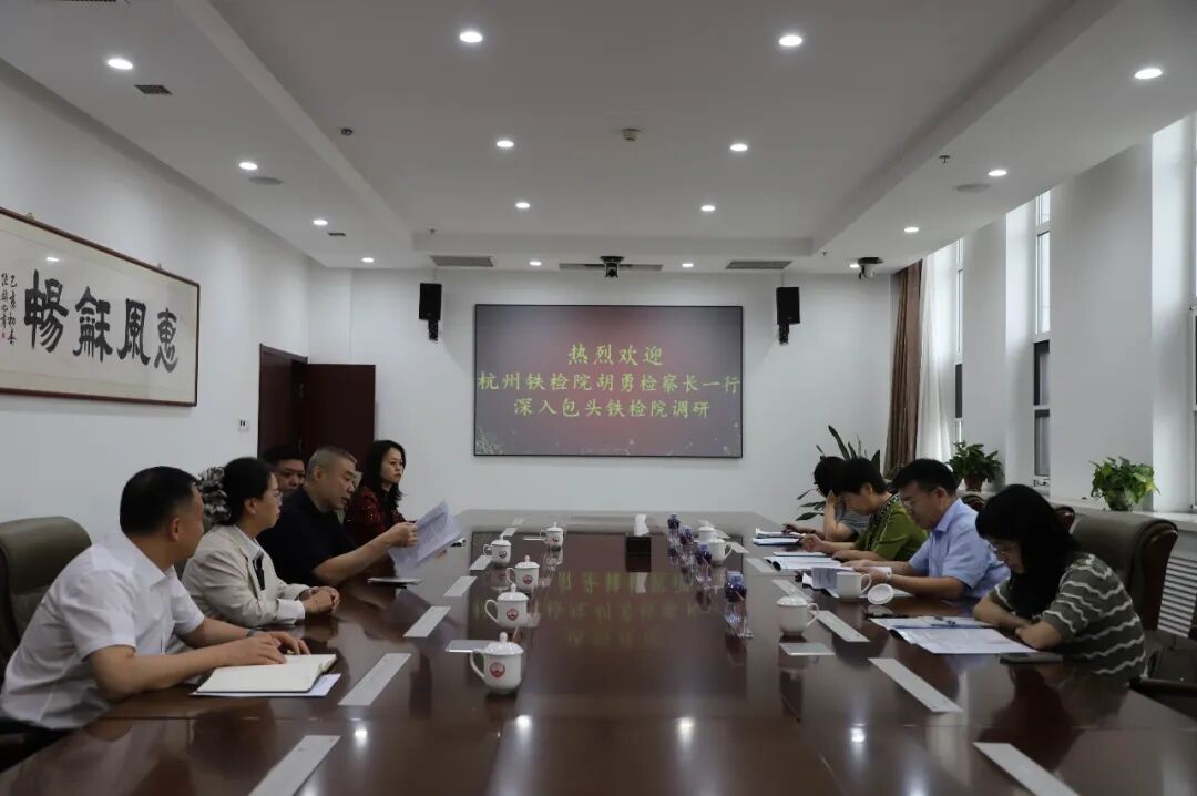 2024年9月11日,杭州铁路运输检察院党组书记、检察长胡勇一行,深入包头铁路运输检察院调研交流。杭州铁路运输检察院党组成员、副检察长王珍,党组成员、政治部主任单旭丹,办公室主任黄炎陪同调研。包头铁路运输检察院党组书记、检察长郑书宇主持座谈会,其他院领导参加了会议。